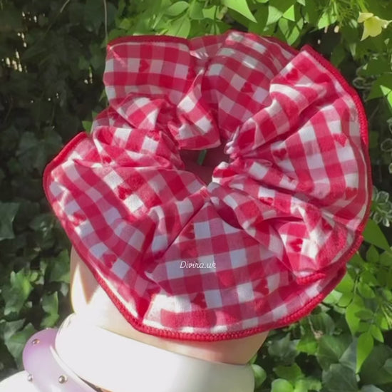 Add a pop of fun to your hairstyle with the RED HEART gingham scrunchie. Its vibrant red gingham pattern brings a cheerful, retro vibe while gently holding your hair in place without damage. Perfect for brightening up any look, this scrunchie combines style and comfort in one playful accessory.