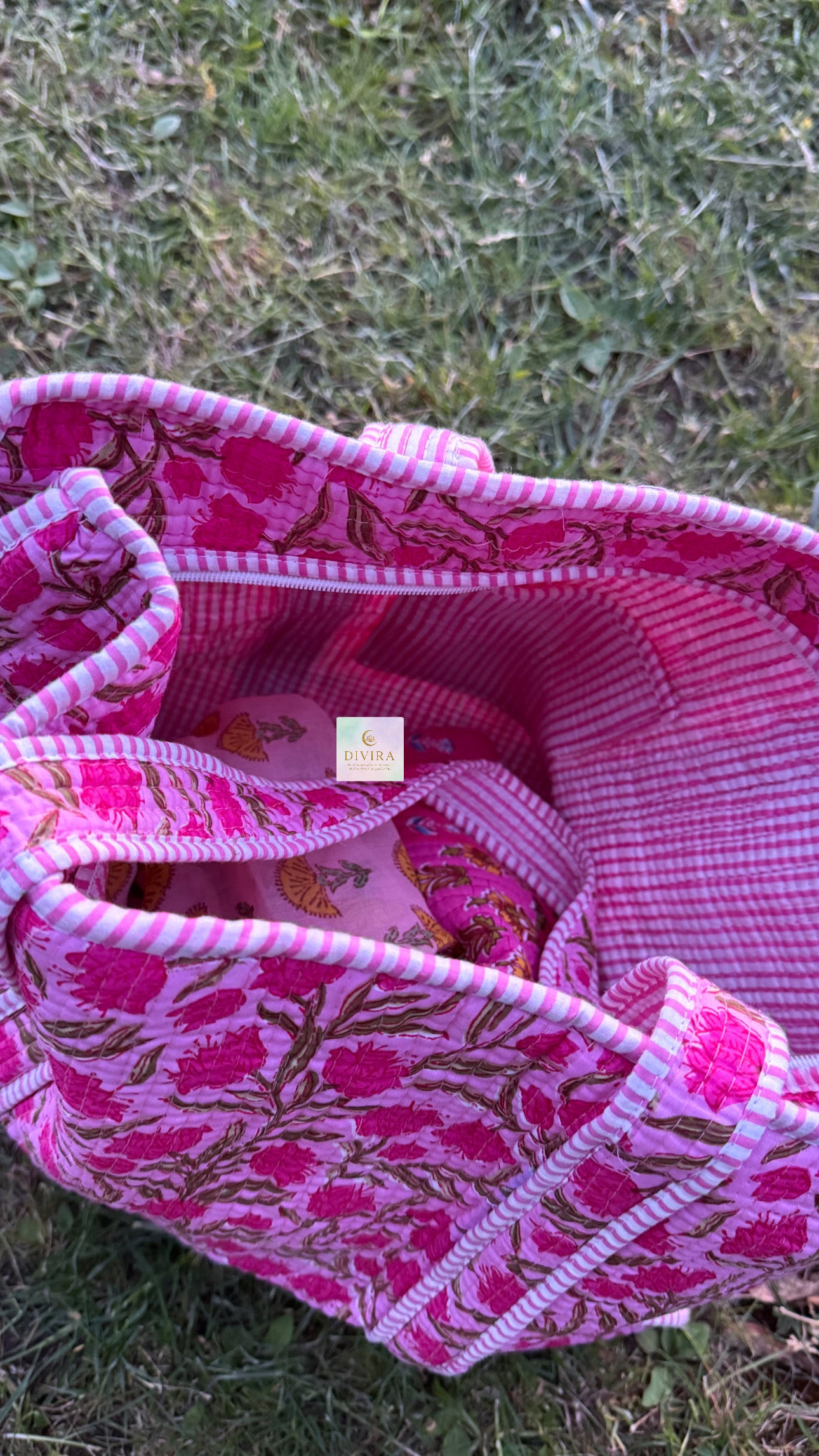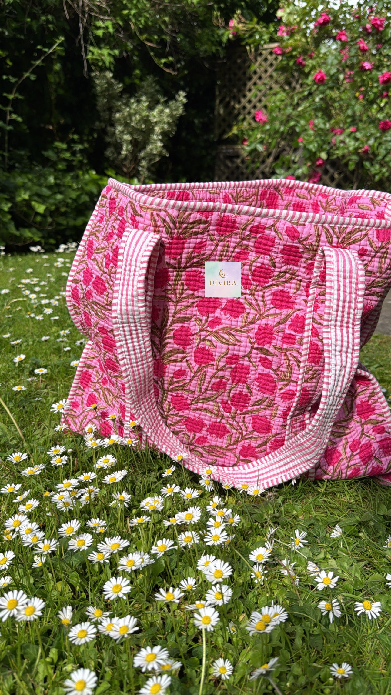 Add a touch of elegance and functionality to your day with our handmade quilted tote bag. Featuring a striking pink floral pattern inspired by Indian artistry, this bag is perfect for any occasion – be it a sunny picnic, a shopping spree, or a casual day out.