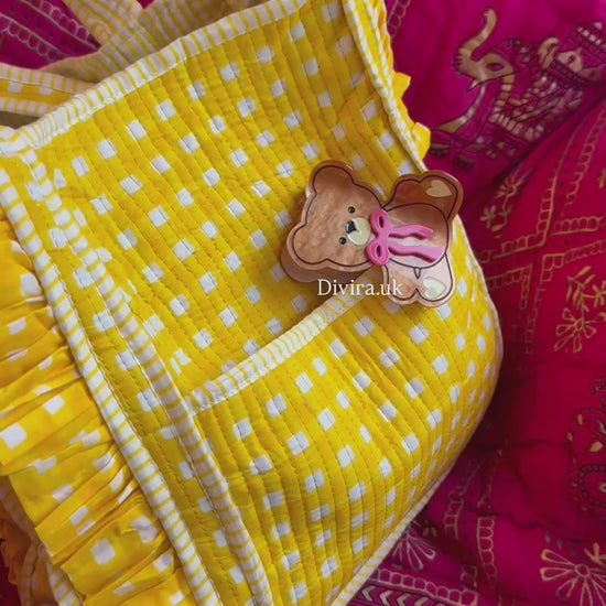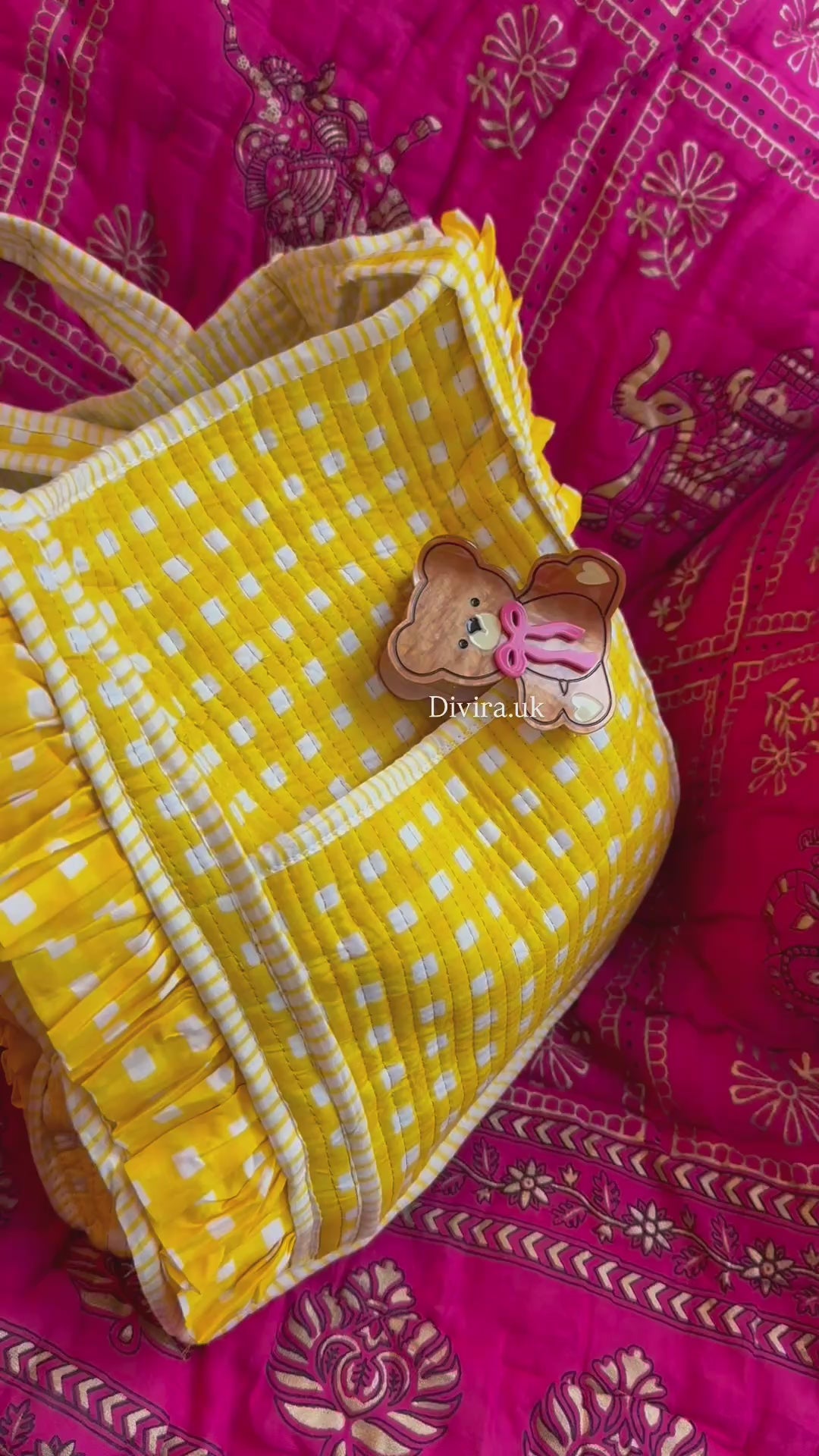 Carry your belongings in style with our Yellow Medium Ruffle Gingham Tote! This quilted tote bag features vibrant yellow fabric with a playful ruffle design. Perfect for a day out with friends or a trip to the beach. No need to worry about zippers, just toss in your essentials and go!